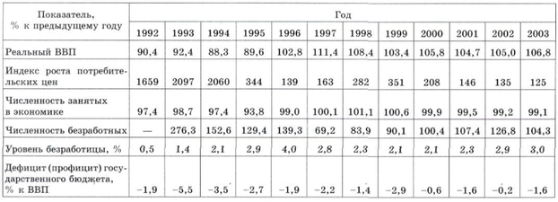Как показывает таблица, в начале указанного периода существовала гиперинфляция, исчисляемая ежегодно тысячами процентов, при этом реальный объем производства ежегодно снижался примерно на 10 % . Лишь в 1995—1996 гг. эта тенденция была переломлена: хотя темпы инфляции остались очень высокими, появился экономический рост. В среднем за 1996—2000 гг. прирост реального ВВП составил 6,3 %, за 2001—2003 гг. — 5,5 %.