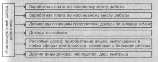 Для наемного работника заработная плата служит основным источником его дохода. Кроме заработной платы индивидуальный доход работника включает в себя и другие составляющие (дивиденды по акциям предприятия, доходы по вкладам в банк, доходы по займам и другие виды доходов).