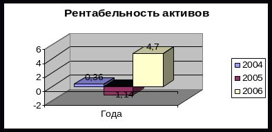 За анализируемые периоды рентабельность активов была небольшая. В 2004 году она составила 0,36%, это значит, что на каждый рубль активов приходится 0,36 рублей прибыли. В 2005 году рентабельность активов была отрицательной и составила - 1,14%. Это произошло из - за отрицательной чистой прибыли. Самая высокая рентабельность из анализируемых периодов была в 2006 году, которая составила 4,7%, что свидетельствует об улучшении деятельности предприятия.