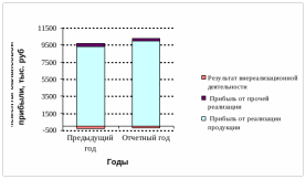 За отчетный год по сравнению с предыдущим балансовая прибыль увеличилась на 687 тыс. руб. или на 7,34%. Это достигнуто в основном за счет роста прибыли от реализации продукции на 700 тыс. руб. или на 7,53%, а также за счет роста внереализационных доходов на 7 тыс. руб. и снижения внереализационных расходов на 60 тыс. руб. При этом понижающее влияние на величину балансовой прибыли оказало снижение прибыли от прочей реализации на 80 тыс. руб. или 23,53%.