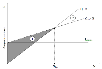 Рис. 1. Залежність витрат і прибутку підприємства від обсягу виконаних робіт: 1 - збитки; 2 - прибуток