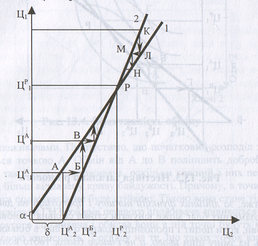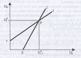 Щоб відшукати систему цін, яка забезпечує одночасну рівновагу на обох ринках, необхідно вирішити систему рівнянь (3) і (4). Графічне вирішення цієї системи показано на рис. 1: лінія 1, рівняння (3) і лінія 2, рівняння (4). Прямі 1 і 2 побудовані із передумови, що коефіцієнти β і γ менші за одиницю, а це означає, що попит і пропозиція на кожному із ринків в більшій мірі залежать від ціни цього, а не іншого блага. За таких умов прямі 1 і 2 перетнуться у першому квадранті, а їх спільна точка покаже вектор рівноважних цін