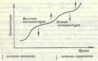 Что же происходит в обратном случае, то есть в период подъема экономической конъюнктуры? Государство в целях предотвращения перегрева экономики и связанных с этим болезненных явлений в хозяйственной жизни проводит политику сдерживания, включающую противоположные мероприятия в области налогово-бюджетной и кредитно-денежной политики.