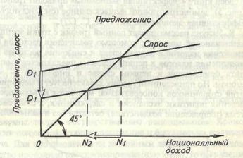 Снижение спроса на величину D1 D2 вызывает сокращение национального дохода с ON1 до ОN2.