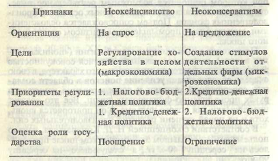 Существуют различные взгляды на причины циклических колебаний; отсюда - и различные подходы к проблеме их регулирования. Однако несмотря на значительный разброс взглядов и различную расстановку акцептов при выработке антициклической политики, в целом можно сказать, что все концепции регулирования циклов тяготеют к одному из двух направлений регулирования: неокейнсианскому или неоконсервативному, развившемуся на базе классической школы. Первое ориентируется на регулирование совокупного спроса, второе - на регулирование совокупного предложения. Для наглядности можно представить их различие в виде табл.1.