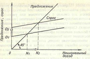 Рост спроса на величину D1 D2 вызывает рост национального дохода от уровня ON1 до ON2. Стрелкой на оси ординат показан сдвиг вверх линии совокупного спроса, стрелка на оси абсцисс показывает увеличение национального дохода2.