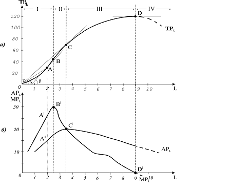 Конфігурація кривої сукупного продукту (рис. 1.1а) ілюструє нерівномірність приростів випуску продукції. Початкова опуклість функції донизу показує, що до точки обсяг продукції зростає швидше, ніж обсяги ресурсу. Праворуч від точки крива стає опуклою вгору – це означає, що зростання обсягу випуску уповільнюється з кожною додатково залученою у виробництво одиницею праці. Таким чином, до точки діє закон зростаючої граничної продуктивності, після неї починає проявлятись закон спадної граничної продуктивності (спадної віддачі). Найбільш виразно ці закони відображає крива граничного продукту праці. Граничний продукт змінного фактора спочатку зростає. Динаміка граничного продукту проходить дві стадії: за низьких обсягів використання змінного фактора гранична продуктивність додатна і зростає, а за високих – додатна, але зменшується. На обох цих стадіях сукупний продукт зростає, досягаючи максимуму. Крива середнього продукту також відображає дію обох законів, проте з деяким запізненням порівняно з кривою. Продуктивність праці зростає до точки, після якої спадає більш повільно, ніж гранична продуктивність.