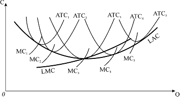 Крива довгострокових граничних витрат не огинає короткострокових кривих. Кожна точка на кривій показує граничні витрати найекономнішого варіанту підприємства для всіх можливих розмірів. Крива перетинає криву в точці її мінімуму.