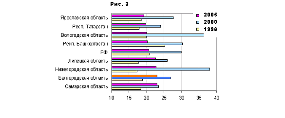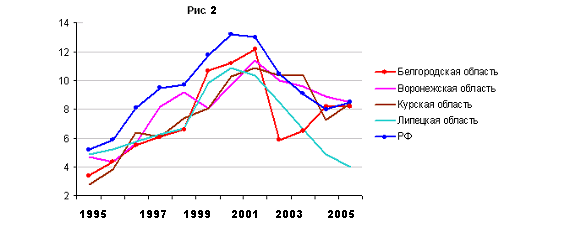 Изменения в состоянии рынка труда отражает динамика уровня общей безработицы (рис. 2). В 1997–1999 гг. безработица резко выросла не только из-за финансового кризиса в России, еще одной причиной были низкие мировые цены на продукцию черной металлургии, что подтверждается схожей динамикой безработицы в Липецкой области — главном металлургическом регионе Центра. За 2000 г. численность безработных сократилась в 2 раза по сравнению с предыдущим годом, а уровень безработицы — с 12,2 до 5,9%.