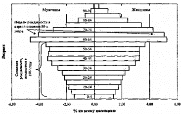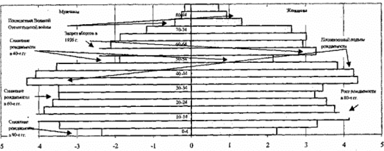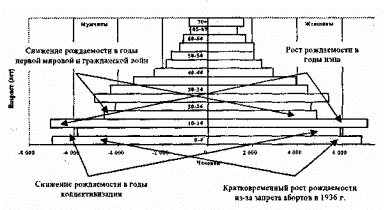 Довольно резкое сужение пирамиды в этих сегментах – следствие потерь населения от военных действий, эпидемий и других неблагоприятных событий той поры. На диаграмме отразились также компенсационное повышение рождаемости в 20‑е гг. (выступ на уровне возраста 10–15 лет), некоторый ее рост в связи с запретом абортов в 1936 г., а также ее резкое падение в начале 30‑х гг., вызванное, вне всякого сомнения, теми социально-экономическими и политическими событиями, которые происходили в стране в то время.
