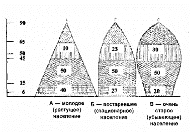 Этим типам возрастной структуры соответствуют типы возрастных пирамид, предложенных в 30‑е гг. XX в. немецким статистиком Ф. Бургдёрфером. Прогрессивной возрастной структуре (молодое население) соответствует правильная пирамида; диаграмма, изображающая стационарную возрастную структуру, напоминает колокол; регрессивной возрастной структуре отвечает фигура, названная (возможно, не без некоторой иронии) урной. Эти фигуры изображены на рис. 4.