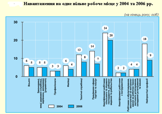 Як видно з рис. 2.2 ні за якою професійною групою навантаження на робоче місце не зросло. На нашу думку, це демонструє покращення балансу між попитом та пропозицією робочої сили на ринку праці України.