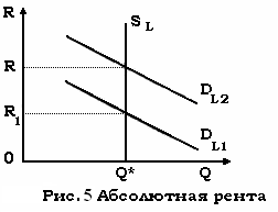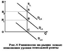 При спросе на землю DL1 рента составит площадь прямоугольника 0R1BC, при спросе DL1 — площадь 0R2AC, при Dl0 — рента равна нулю.