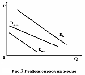Земля используется как в сельскохозяйственных, так и в несельскохозяйственных целях, что обусловливает существование двух видов спроса на землю: Dсх, — сельскохозяйственный спрос. Dнсх — несельскохозяйстный спрос. Совокупный спрос на землю DL, будет представлять собой, сумму двух указанных видов спроса: