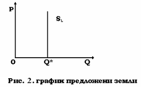 Неоклассическая трактовка земельной ренты основывается на методе анализа спроса и предложения. Уникальность земли как фактора производства — в ее ограниченности, недвижимости, неперемещаемости. Из этого неоклассики сделали вывод о механизме взаимодействия спроса на землю и предложения земли. Предложение земли является абсолютно неэластичным по цене, т.е. даже в условиях значительного роста, цен предложение земли будет оставаться фиксированным. Графически это означает, что кривая предложения земли SL представляет собой линию, параллельную оси ординат (рис. 2.).