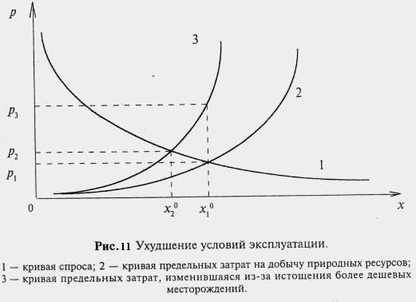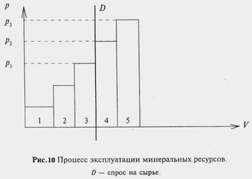 Предположим, что потребность в сырье постоянна и составляет 3V. Вначале мы эксплуатируем месторождения с первого по третье, и цена устанавливается на уровне р1. Затем из-за того, что первое месторождение истощилось, мы вынуждены перейти на четвертое, и цена природного сырья увеличивается до р2 (из-за сдвижки эксплуатационных издержек влево). Если добыча природного сырья прекратится и на втором месторождении, то цена увеличится до р3. Этот пример иллюстрирует, как наиболее дешевые месторождения вытесняются более дорогими.