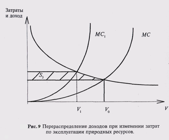 Теперь предположим, что затраты на обеспечение водой увеличились (вместо кривой МС — теперь новая кривая MC1). Объем недопотребления упал с Vo до V1, и потребитель воды потерял доход, равный S3 (см. рис. 9).