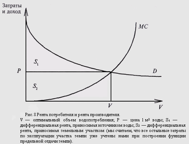 Предположим теперь, что в качестве природного ресурса рассматриваются водные ресурсы, а их потребителем является сельское хозяйство. На рис. 8 изображены: D — функция спроса на воду; МС — функция предельных затрат на обеспечение потребления воды в заданном объеме.