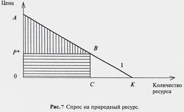 Обычно с точки зрения теории общественного благосостояния кривую спроса предлагается интерпретировать как кривую, обозначающую желание платить каждого индивида за то или иное количество ресурса. Отметим, что эта кривая строится в условиях постоянства доходов потребителя, т.е. вдоль кривой спроса доходы потребителя и их благосостояние в целом не меняются. Такая кривая спроса называется кривой спроса по Маршаллу. При этом некоторые готовы платить за ресурс величину ОА, другие — р*С, спрос третьих, а значит, и желание платить равно нулю. В данном случае именно желание платить и становится мерой предпочтений потребителей. Если р* — рыночная цена ресурса, то на самом деле все потребители платят величину Ор*ВС, желание же их платить измеряется величиной ОАВС, если учесть, что всего на рынке по цене р * предложено С ресурса. Желание платить складывается из избытка потребителя р*АВ и фактически уплаченной величины Ор*ВС. Иногда величину р *АВ называют чистым желанием платить (ЧЖП), поскольку она дает представление о чистом выигрыше потребителей при покупке природного ресурса.