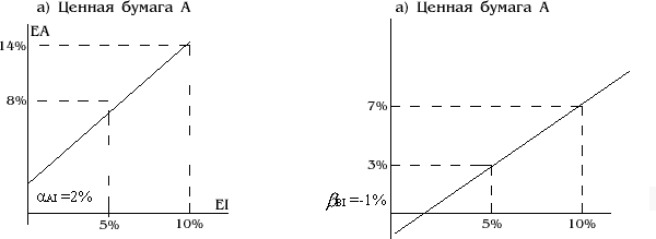 Здесь по вертикальной оси отложена доходность ценной бумаги (EA), а по горизонтальной оси - доходность на рыночный индекс (EI). Линия проходит через точку на вертикальной оси, соответствующую значению aAI, которое в данном случае составляет 2%. Линия имеет наклон, равный bAI, или 1,2. Часть б) рис. представляет собой график рыночной модели ценной бумаги В. Уравнение данной прямой имеет следующий вид: