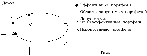 Рис. Недопустимые, допустимые и эффективные портфели