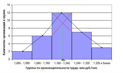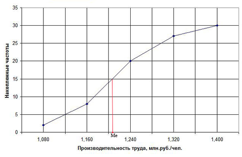 Вывод: Мода, равная 1,204 млн. руб./чел. показывает, что наиболее часто в выборочной совокупности организаций производительность труда будет составлять 1,204 млн. руб./чел.