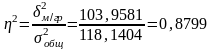 Между изучаемыми признаками имеет место корреляционная связь. Эмпирическое корреляционное отношение η =0,9380 в соответствии со шкалой Чеддока говорит о весьма тесной степени связи изучаемых признаков. Коэффициент детерминации η2 =0,8799 (или 87,99%) показывает, что изменение производительности труда обуславливает изменение объема товарооборота на 87,99%