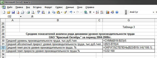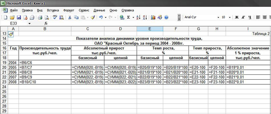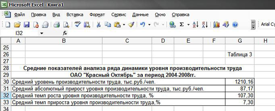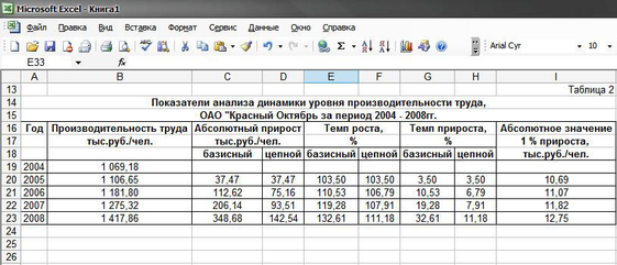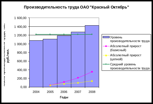 Вывод: Как показывают данные Таблицы 2, уровень производительности труда ОАО "Красный Октябрь" постоянно повышался. В целом за исследуемый период уровень производительности труда повысился на 348,68 тыс. руб./чел. или на 32,61%