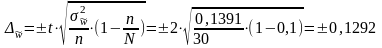 Вывод: Ошибка выборки доли организаций с уровнем производительности труда 1,300 млн.руб./чел. и более составляет 12,92%. С вероятностью 0,954 можно утверждать, что генеральная доля будет находиться в пределах от 3,8% до 29,6%.