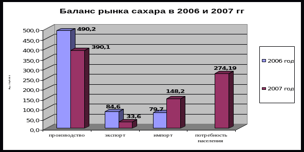 Общий объем производства сахара за 2007 год составил – 390,1 тыс. тонн сахара, что по сравнению с аналогичным периодом прошлого года меньше на 20%.