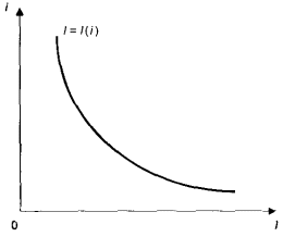 Инвестиции представляют собой обратную функцию от процентной ставки: I = f(i). Эта убывающая функция представлена на рис. 6.