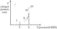 На восходящем отрезке увеличение реального объема выпуска сопровождается повышением цен. Положительный наклон кривой показывает прямую зависимость выпуска от уровня цен. Увеличение совокупного спроса вызовет и повышение цен, и рост объемов производства.