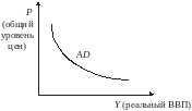 Кривая совокупного спроса AD - количество товаров и услуг, которое способны приобрести потребители при сложившемся уровне цен. Точки на кривой представляют собой комбинации выпуска (Y) и общего уровня цен (Р), при которых рынки товаров и денег находятся в равновесии (рис. 1).