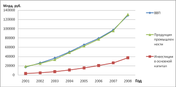 Рис. 2.3 Рост ВВП, продукции промышленности, инвестиций в основной капитал в Республике Беларусь в 2001 – 2008 гг., млрд. руб.
