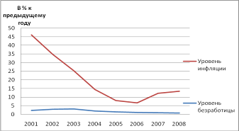 Рис. 2.4 Динамика уровней инфляции и безработицы (в % к предыдущему году) в 2001 – 2008 гг.