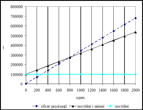 Рис. 8.1 – Графік взаємозв’язку показників обсягу виробництва, витрат і прибутку