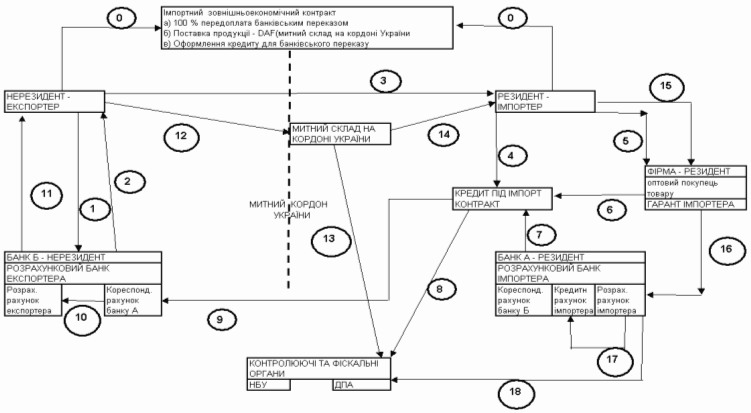 Рис.1.1. - Схема операцій при імпортному контракті на умовах 100% передоплати банківським переказом при його страхуванні письмовою гарантією банка експортера