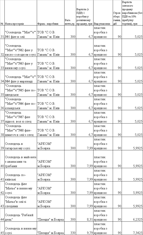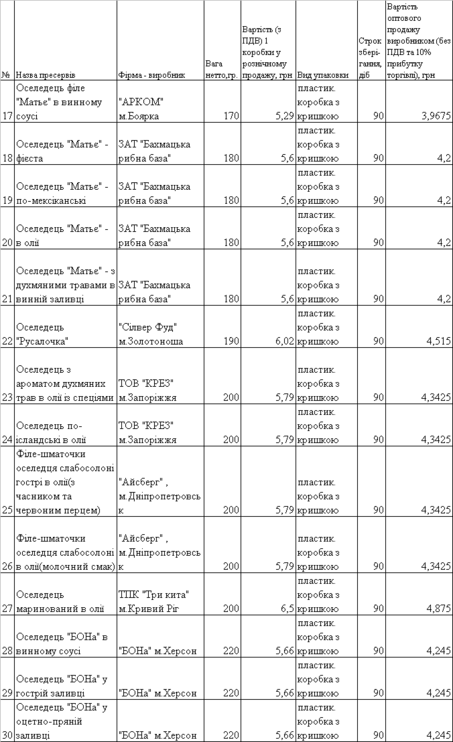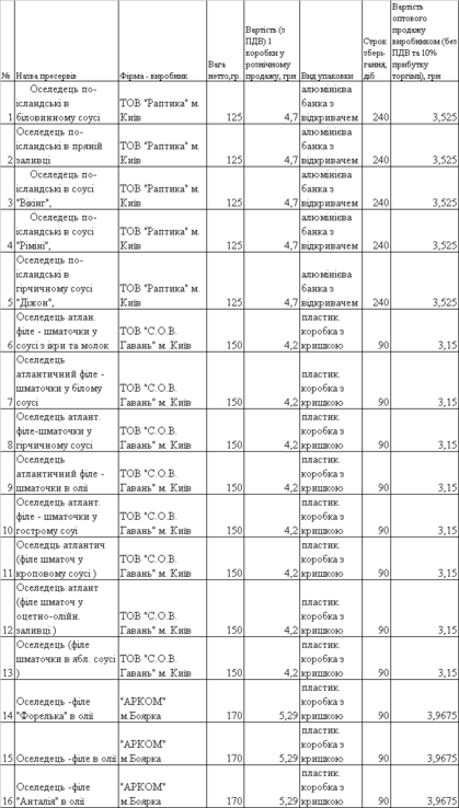 Таблиця 3.2. Основні цінові та асортиментні види пресервів на ринку України