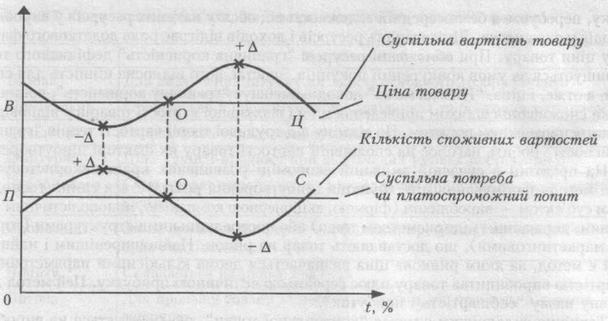 Значенням кількісного надлишку споживних вартостей на ринку (+∆ на кривій С) відповідають значення ціни товару, нижчі від його вартості (-∆ на кривій Ц), і навпаки.