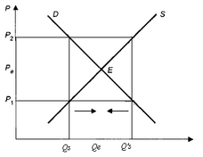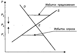 Если же рыночная цена Р2 будет выше равновесной Ре, на рынке образуется избыток предложения (Q's > Q'd), в результате чего усилится конкуренция продавцов и рыночная цена установится на уровне равновесной.