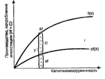 Имея производственную функцию у=f(к) и функцию потреблений, преобразованную в функцию инвестиций и=су, можно представить инвестиции на одного работника как функцию от капиталовооруженности (фондовооруженности):