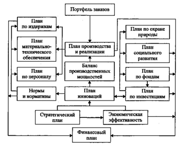 На рисунке 3.1 изображены разделы тактического плана и информационные связи между ними, показанные стрелками. Основу тактического плана составляют стратегический план и портфель заказов предприятия, сформированный на планируемый период. На базе стратегического плана разрабатывается план инноваций, а на базе портфеля заказов — план производства и реализации продукции. План производства и реализации продукции является основным в структуре тактического плана. Он устанавливает возможности предприятия по производству и реализации продукции в планируемом периоде. Задания этого плана определяют показатели остальных разделов тактического плана: плана по издержкам, прибыли и рентабельности; плана материально-технического обеспечения; плана по персоналу и оплате труда.
