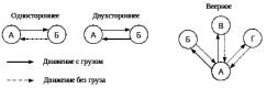 Маятниковые маршруты устанавливаются между двумя пунктами. Они могут быть односторонними, когда транспортные средства двигаются в одну сторону с грузом, а в другую — без груза, двухсторонними, когда грузы транспортируются в обоих направлениях, и веерными (рис. 4.3).