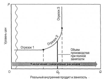 Когда увеличиваются совокупные расходы, уровень цен обычно сначала начинает расти еще до того, как достигается полная занятость (отрезок 1), а затем растет параллельно приближению, достижению и превышению уровня полной занятости (отрезок 2). Наконец, происходит их резкий рост в тот момент, когда реальный выпуск приближается, достигает максимального значения при полной занятости мощностей (отрезок 3). На отрезках 2 и 3 возникает инфляция спроса.