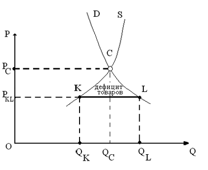 Равновесная цена, определяемая соотношением спроса (D) и предложения (S) в точке С, равна уровню PC. Государство устанавливает постоянные цены (PKL), при которых объем предложения товарной массы QK, а объем спроса QL.