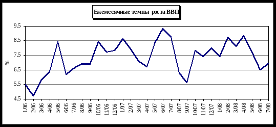 Как видно из таблицы 1, практически по всем важнейшим экономическим показателям темпы роста в июле 2008 года были ниже, чем в июле 2007 года. Исключение составляют только показатели внешнеторговой деятельности и сельское хозяйство. Особенно сильное снижение отмечено в темпах роста инвестиций – этот показатель опустился ниже уровня 10%. Вместе с тем в июле восстановилась положительная динамика в жилищном строительстве, что можно считать первым признаком улучшения экономической ситуации.