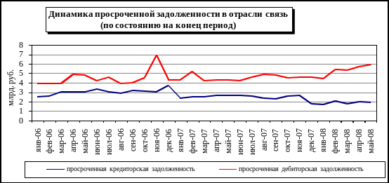 Данные по величине просроченной кредиторской и дебиторской задолженностей по состоянию на конец мая 2008 года в отрасли связь представлены в таблицах 9 и 10. Как видно из рисунка 4, в 2008 году в отрасли заметно растет просроченная дебиторская задолженность. В то же время просроченная кредиторская задолженность ниже, чем в прошлом году. В том числе, отмечено существенное сокращение просроченной задолженности по банковским кредитам.