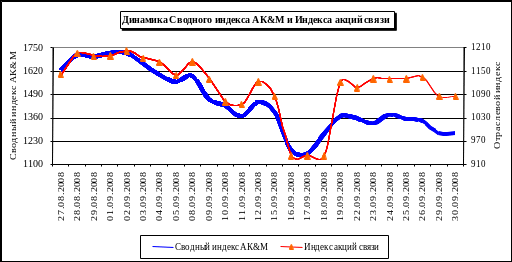 На протяжении 2008 года цены на бумаги телекоммуникационных компаний демонстрировали снижение, а в середине сентября на рынке наблюдался настоящий обвал котировок, что в основном было связано с общерыночными тенденциями. Отдельно стоит отметить, что темпы снижения рынка в рассматриваемом периоде были несколько ниже, чем темпы падения котировок ряда компаний телекоммуникационного сектора. Так, за анализируемый период снижение рынка составило более 21%, в то время как компании телекоммуникационного сектора продемонстрировали падение на 15-45%.
