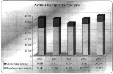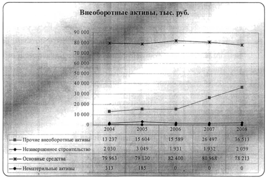 Иммобилизованные активы компании в рассматриваемом периоде существенно отличались от динамики валюты баланса и на 1.01.2005 г. составили в абсолютном выражении 116785 тыс. рублей. Их доля в валюте баланса предприятия составляла не менее 70%, средний показатель роста за последние два года составил более 8%.