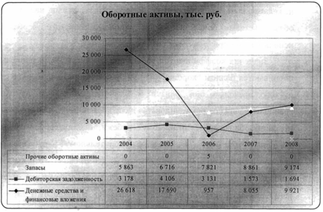 Подобное изменение в относительном выражении иммобилизованных активов отображалось и на поведении мобильных оборотных активов, к которым относятся запасы, дебиторская задолженность и прочие оборотные активы, следующим образом: их доля в валюте баланса после роста в 2002 до отметки 10957 тыс. рублей снизилась в 2003 году на 1,8%, а в 2004 выросла4,2%, практически превысив показатель 2001 года на 46 тыс. рублей.